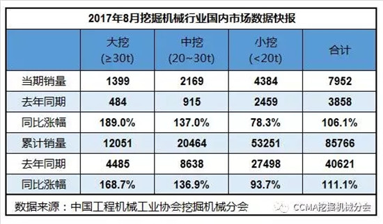 2017年8月,共計(jì)銷售各類挖掘機(jī)械產(chǎn)品8714臺(tái),同比漲幅99.5%。國(guó)內(nèi)市場(chǎng)銷量(不含港澳臺(tái))7952臺(tái),同比漲幅106.1%。出口銷量757臺(tái),同比漲幅49.6%。