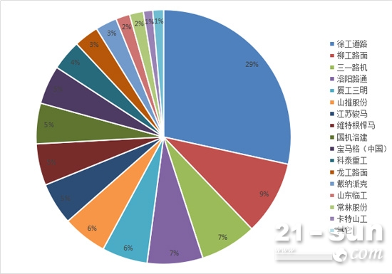 整體來看,徐工道路一家獨大,領(lǐng)先優(yōu)勢明顯;第二梯隊競爭激烈,除柳工路面達(dá)到9.4%,還有7個品牌市場占有率在5%以上(8%以下)。