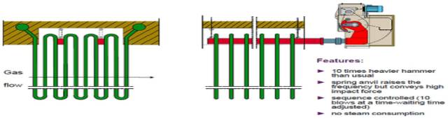 (3)清灰設(shè)計(jì):尾部煙氣受熱面采用機(jī)械沖擊振打裝置、震動(dòng)傳遞梁采用水冷模式、適用于懸吊受熱面、機(jī)械清灰采用程序控制模式,使整個(gè)受熱面部件均能夠得到良好的過(guò)程清潔,保持很好的煙氣與管道內(nèi)介質(zhì)換熱過(guò)程。
