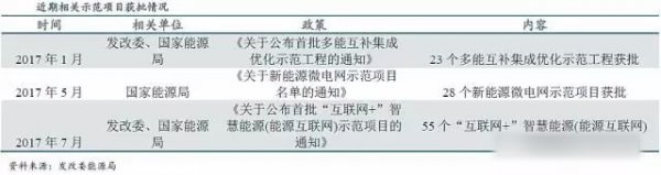 《辦法》規(guī)定,微電網(wǎng)須具備微型、清潔、自治、友好等基本特征。電源以當(dāng)?shù)乜稍偕茉窗l(fā)電為主,或以天然氣多聯(lián)供等能源綜合利用為目標(biāo)的發(fā)電形式,鼓勵(lì)采用燃料電池等新型清潔技術(shù)。其中,可再生能源裝機(jī)容量占比在50%以上,或天然氣多聯(lián)供系統(tǒng)綜合能源利用效率在70%以上?!掇k法》中明確提出微電網(wǎng)內(nèi)部的新能源發(fā)電項(xiàng)目建成后,按程序納入可再生能源發(fā)展基金補(bǔ)貼范圍。近期相關(guān)示范項(xiàng)目獲批情況見(jiàn)下表。