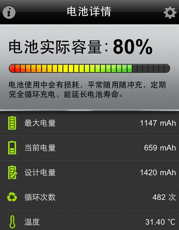 筆者在網(wǎng)上找到了兩個鋰電池循環(huán)充放電的例子,一張截圖顯示的是一塊1420mAh的iPhone 4鋰電池完成482次循環(huán)充放電后,電池剩余電量1147mAh,較比出廠容量衰減了20%