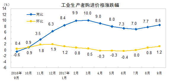 2017年9月份,全國工業(yè)生產(chǎn)者出廠價格同比上漲6.9%,環(huán)比上漲1.0%。工業(yè)生產(chǎn)者購進價格同比上漲8.5%,環(huán)比上漲1.2%。1-9月平均,工業(yè)生產(chǎn)者出廠價格同比上漲6.5%,工業(yè)生產(chǎn)者購進價格同比上漲8.4%。