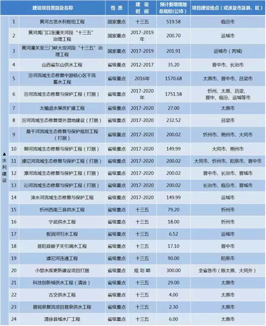 山西省土地利用總體規(guī)劃“十三五”新增重點(diǎn)建設(shè)工程(項(xiàng)目)及用地情況詳情: