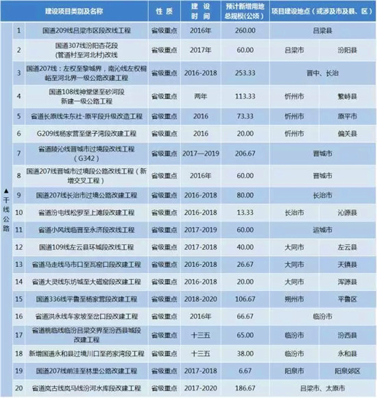 山西省在通知中公布了“十三五”期間,將要新增的重點(diǎn)建設(shè)工程(項(xiàng)目)及用地情況,涵蓋了交通建設(shè)類、水利建設(shè)類、能源建設(shè)類、煤化工及其他、扶貧移民搬遷、其他建設(shè)(園區(qū))等六大類,山西省馬上就要新建25個(gè)機(jī)場(chǎng)、9條鐵路、16條高速、20條干線公路…...