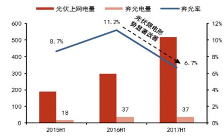 2015H1-2017H1 全國(guó)光伏棄光限電情況(億千瓦時(shí))