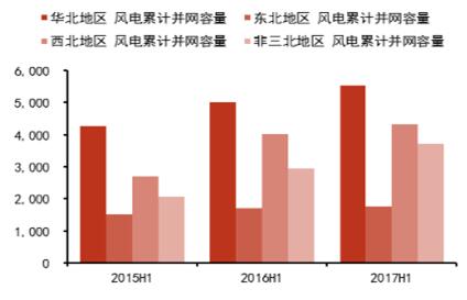 2015H1-2017H1年各地區(qū)風(fēng)電累計(jì)并網(wǎng)容量(萬(wàn)千瓦)
