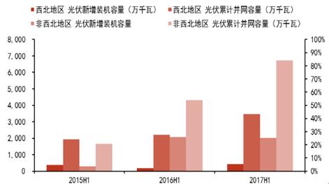 至 2017 年上半年,西北地區(qū)光伏累計(jì)裝機(jī) 3458.9 萬(wàn)千瓦,非西北地區(qū)累計(jì)裝機(jī) 6723.1 萬(wàn)千瓦.2015-2017 年上半年間,非西北地區(qū)光伏累計(jì)裝機(jī)全國(guó)占比從 46%持續(xù)增長(zhǎng)至 66%,相應(yīng)地西北地區(qū)光伏累計(jì)裝機(jī)占比下降 20 個(gè)百分比降至 66%,光伏建設(shè)中心逐漸從西北轉(zhuǎn)移至中東部地區(qū)。