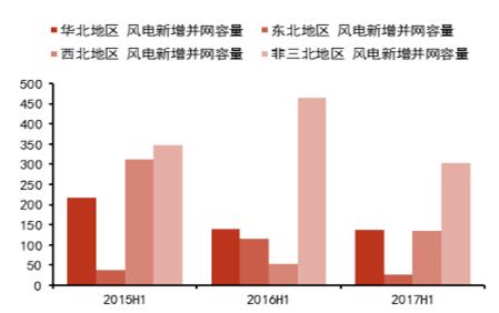 2015H1-2017H1各地區(qū)風(fēng)電新增并網(wǎng)容量 (萬(wàn)千瓦)