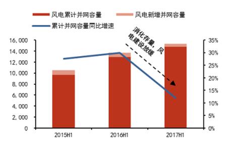 2017年上半年,為改善棄風(fēng)棄光問(wèn)題,消化現(xiàn)有存量,增量風(fēng)電建設(shè)逐步放緩。全國(guó)風(fēng)電新增并網(wǎng)容量601萬(wàn)千瓦,相較15、16 年上半年新增容量有所下滑,但仍然繼續(xù)保持穩(wěn)步增長(zhǎng)勢(shì)頭,累計(jì)并網(wǎng)容量達(dá)到 1.54 億千瓦,同比增長(zhǎng) 12%。