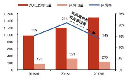 2015H1-2017H1全國(guó)風(fēng)電棄風(fēng)限電情況 (億千瓦時(shí))