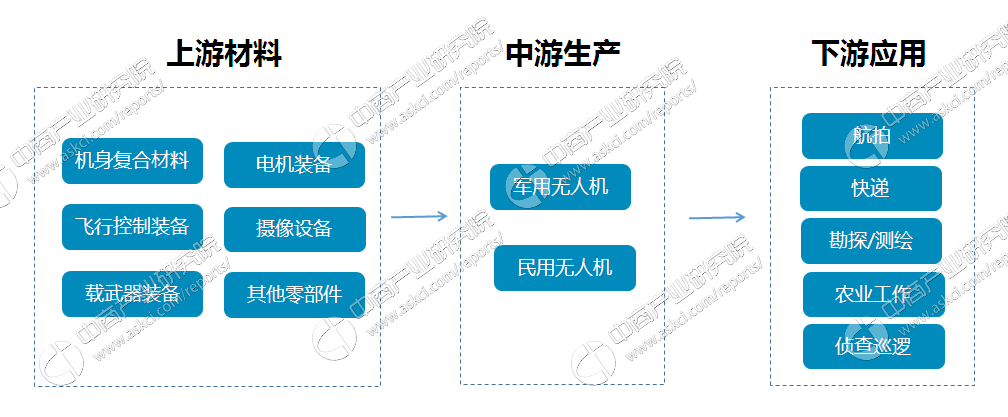 在無人機(jī)產(chǎn)業(yè)鏈中中,上游主要是各種制造無人機(jī)的材料,有機(jī)身復(fù)合材料、電機(jī)裝備、飛行控制裝備、攝像設(shè)備等;下游為各類民間、商業(yè)、軍工應(yīng)用領(lǐng)域,包括航拍、快遞、勘探、測繪以及偵查巡邏等。