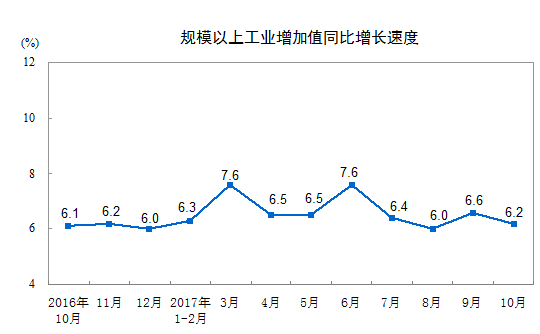 統(tǒng)計局:2017年10月規(guī)模以上工業(yè)增加值增長6.2%