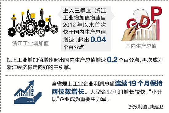金秋收獲季,浙江工業(yè)經(jīng)濟(jì)畫出一道漂亮的上揚(yáng)線,呈現(xiàn)明顯好于去年同期、明顯好于全國(guó)平均水平、明顯好于主要工業(yè)強(qiáng)省的積極態(tài)勢(shì)。進(jìn)入三季度,浙江工業(yè)增加值增速自2012年以來首次快于國(guó)內(nèi)生產(chǎn)總值增速,超出0.04個(gè)百分點(diǎn),且規(guī)模以上工業(yè)增加值增速超出國(guó)內(nèi)生產(chǎn)總值增速0.2個(gè)百分點(diǎn),再次成為浙江經(jīng)濟(jì)穩(wěn)走向好的主引擎。