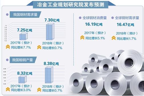 近日,由冶金工業(yè)規(guī)劃研究院舉辦的2018中國和全球鋼鐵需求預測研究成果、鋼鐵企業(yè)競爭力評級發(fā)布會在北京召開。根據(jù)國內(nèi)外經(jīng)濟發(fā)展形勢以及國內(nèi)下游行業(yè)的發(fā)展特點,冶金工業(yè)規(guī)劃研究院預測,2017年我國鋼材需求量為7.25億噸,同比增長7.7%;2018年我國鋼材需求量為7.30億噸,同比增長0.7%。