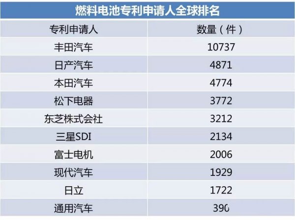 根據(jù)上??萍记閳笱芯克鶎θ剂想姵叵嚓P專利的檢索分析,燃料電池專利申請人全球排名中,日本豐田汽車以10,737個專利族居首,大幅領先競爭對手。在前十名的企業(yè)中,7家為日本企業(yè)。各企業(yè)掌握的專利數(shù)量差距較大,技術主要集中在排名前五的大公司手中。