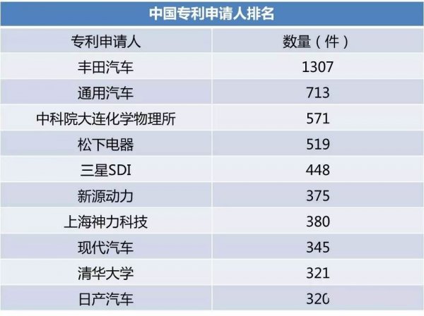 在中國申請專利的申請人中,排在最前的也是日本豐田汽車,共1307項。通用汽車以713項位居第二。本土研究機構中科院大連化學物理所排名第三,新源動力股份有限公司、上海神力科技、清華大學分別排名第六、第七和第九。