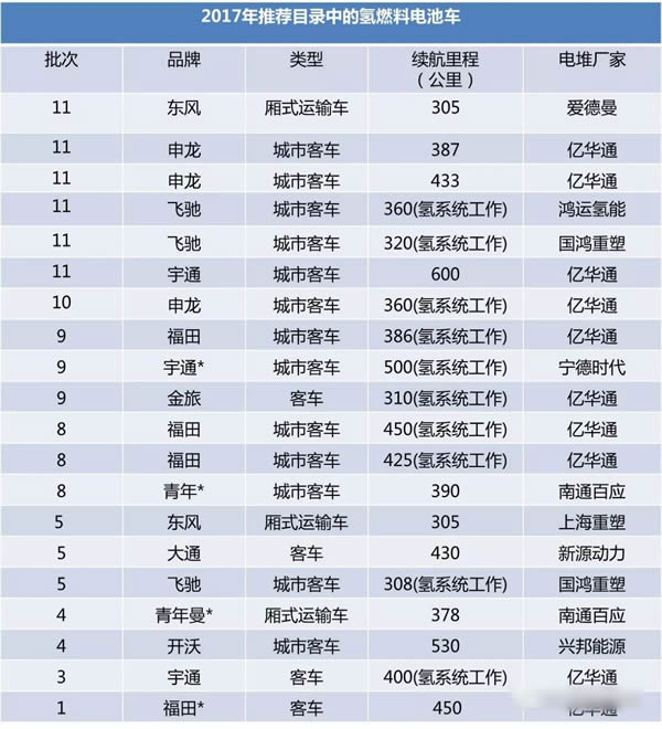 2017年12月初,工信部公布了第11批新能源汽車推薦目錄。今年以來,全國已有217家企業(yè)的3113個車型進入目錄。在這其中,共有20款氫燃料電池入選,占全部車型的千分之六。車型以客車為主,共17輛,另有3輛為廂式運輸車。品牌分布較為均勻,其中北汽福田有4款福田牌客車入選,上海申龍、佛山飛馳、宇通客車各有3款入選。