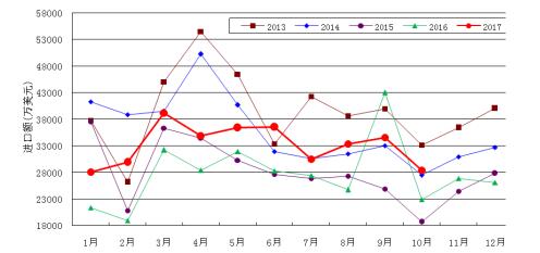2017年10月進(jìn)口額2.84億美元,同比增長(zhǎng)23.8%;出口額18.62億美元,同比增長(zhǎng)49.6%。