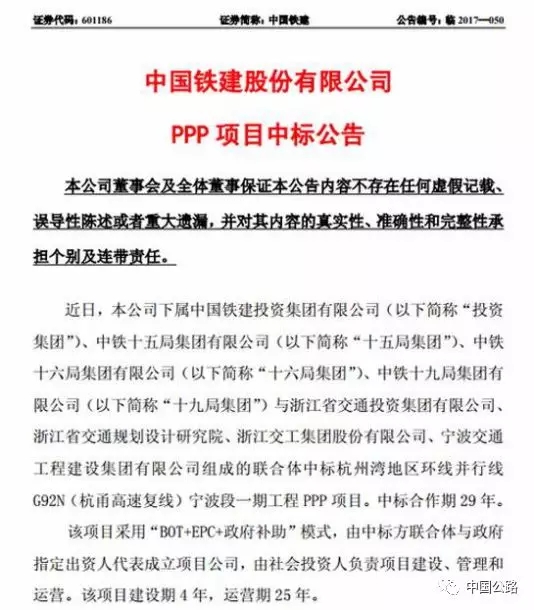 去年8月,中國(guó)鐵建發(fā)布公告稱(chēng),其聯(lián)合體中標(biāo)杭州灣地區(qū)環(huán)線并行線G92N(杭甬高速?gòu)?fù)線)寧波段一期工程PPP項(xiàng)目,總投資約180.96億元,預(yù)計(jì)建設(shè)期4年,運(yùn)營(yíng)期25年。