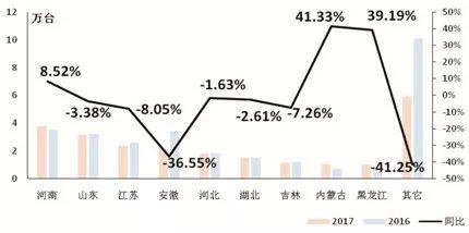 2017年收獲機(jī)區(qū)域市場呈現(xiàn)出兩個突出特點(diǎn),第一,區(qū)域集中度提高。銷售萬臺以上的區(qū)域共9個,累計(jì)銷售各種聯(lián)合收獲機(jī)18.07萬臺,同比小幅下滑4.39%;占比75.35%,較之2016年同期上揚(yáng)10.09個百分點(diǎn)。第二,冰火同爐,“3上5下”。在前9大區(qū)域市場中,僅有河南、內(nèi)蒙古、黑龍江3大市場出現(xiàn)大幅度攀升,分別銷售3.82萬臺、1.06萬臺、1.03萬臺,同比分別增長8.52%、41.33%和39.19%。占比分別為15.93%、4.42%和4.3%,同比上揚(yáng)3.78、1.83和1.74個百分點(diǎn)。其它主流區(qū)域呈現(xiàn)不同程度的下滑。山東市場2017年銷量雖在3萬臺,但同比小幅下滑3.38%。安徽市場出現(xiàn)“跳水”,銷售2.17萬臺,同比大幅度下滑36.55%。