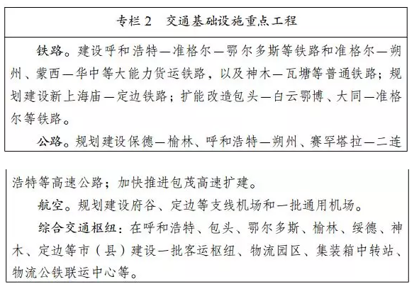 建設(shè)呼和浩特-準(zhǔn)格爾-鄂爾多斯等鐵路和準(zhǔn)格爾-朔州、蒙西-華中等大能力貨運(yùn)鐵路,以及神木-瓦塘等普通鐵路;