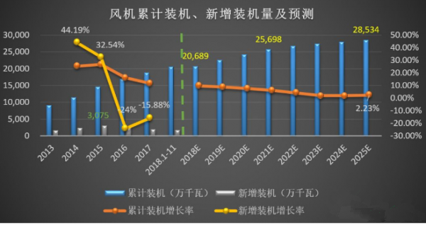 2016年11月29日,國家能源局印發(fā)《風(fēng)電發(fā)展“十三五”規(guī)劃》,根據(jù)規(guī)劃提出總量目標(biāo),到2020年底,風(fēng)電累計并網(wǎng)裝機容量確保達到2.1億千瓦以上,下圖為2013年至2018年1-11月各年新增裝機、累計裝機容量和各自增長率變化數(shù)據(jù),以及通過未來經(jīng)濟增長率、可再生能源總裝機、風(fēng)電總裝機等推算預(yù)測出2018至2025年風(fēng)電累計裝機容量以及其增長率。