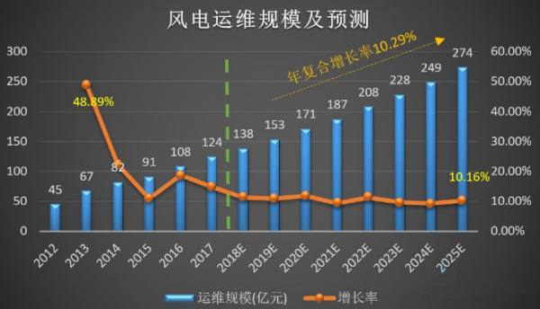 下圖為2012年至2017年風(fēng)電運維市場規(guī)模、2018至2025年運維市場規(guī)模預(yù)測以及其年復(fù)合增長率。