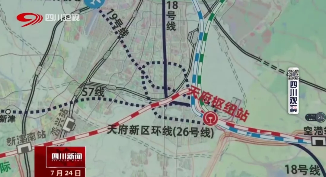 成都軌道交通18號線線路圖中的天府新站,即天府樞紐站,位于興隆湖附近。
