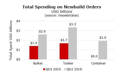 與2018年同期相比,2019年第二季度所有船型的新造船市場(chǎng)大幅放緩,油船訂單同比減少一半,集裝箱船訂單受貿(mào)易戰(zhàn)影響最大。