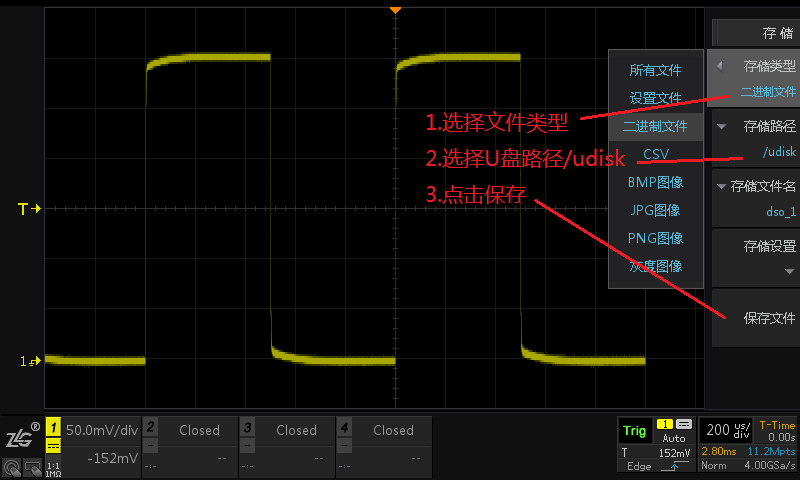 數(shù)據(jù)采集后,我們可以把數(shù)據(jù)以二進(jìn)制或者CSV格式導(dǎo)出保存,然后再開啟下一輪的采樣,這樣可以實(shí)現(xiàn)更長(zhǎng)時(shí)間的波形記錄,示波器支持三種不同的導(dǎo)出方法。