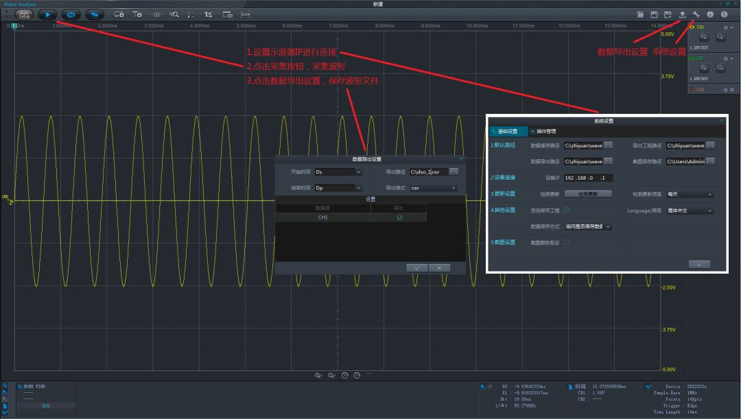 ZDS示波器配套的PC軟件Wave Analyze具有強(qiáng)大的功能,其中也包括有波形導(dǎo)出。Wave Analyze通過網(wǎng)絡(luò)與示波器連接,可以將示波器采集到的波形上傳到PC端作進(jìn)一步分析,或?qū)С龀晌募?。該方法需要依賴PC軟件,好處是還可以在PC端進(jìn)行波形分析,可操作性更強(qiáng)。方法如下: