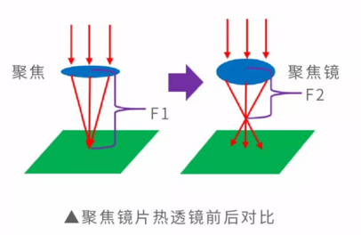 功率越高、加工高反材料,光學元件受熱膨脹越迅速,熱透鏡越明顯;產生熱透鏡效應時,光學元件受熱膨脹,出現聚焦能力變強,聚焦光斑尺寸變小,焦距和焦深變短現象。